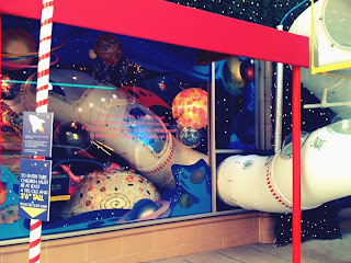 This is an interactive window for kiddos to climb in and out of "outer space."